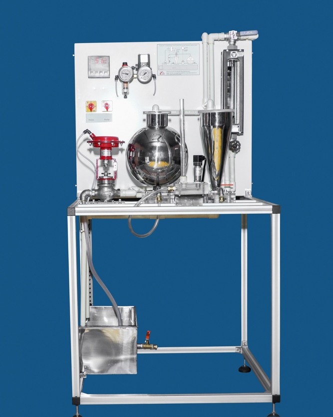 |   The Spherical Tank Level Process Trainer (ACE 303) is designed to understand the elements of a non-linear level process and its control. It consists of spherical process tank fitted with a level transmitter and necessary drain valve arrangements. The inlet flow to the tank is controlled by a control valve which operates on a 3 to 15 psi pressure signal. A current to pressure (I/P) converter is used to convert the output of the controller (4-20mA) to the signal pressure. The process parameter is controlled by a microcontroller based digital indicating controller. These units along with necessary piping are fitted on the support frame. The setup is designed for tabletop placement and access. The controller is connected to computer through USB for monitoring and controlling the process. User friendly software will be supplied along with the hardware to perform different set of experiments.